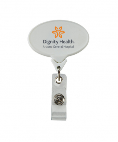 Oval design features rotating alligator clip for universal use. 30" sturdy nylon retracting cord and strong snap lock. Rotating alligator clip on back.