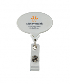 Oval design features rotating alligator clip for universal use. 30" sturdy nylon retracting cord and strong snap lock. Rotating alligator clip on back.
