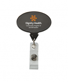 Oval design features rotating alligator clip for universal use. 30" sturdy nylon retracting cord and strong snap lock. Rotating alligator clip on back.