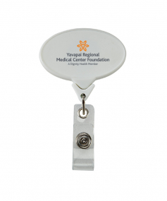 Oval design features rotating alligator clip for universal use. 30" sturdy nylon retracting cord and strong snap lock. Rotating alligator clip on back.