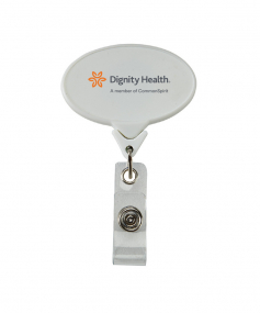 Oval design features rotating alligator clip for universal use. 30" sturdy nylon retracting cord and strong snap lock. Rotating alligator clip on back.