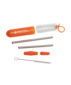 The Paloma 5-Piece stainless steel straw set comes in an oval cylinder case with a transparent cap and a colored bottom. The lid has a beaded silicone locking strap to attach to your backpack, purse or bag making it convenient to travel with. This set includes 2 stainless steel straw parts that can be used individually or linked together with a silicone connector for use in taller cups, a cleaning brush and a silicone tip to drink from. The maximum straw length is 10 1/4" with the connector and . Complies with Prop 65. 1" W x 6" H x 1" D