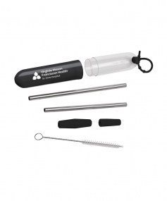 The Paloma 5-Piece stainless steel straw set comes in an oval cylinder case with a transparent cap and a colored bottom. The lid has a beaded silicone locking strap to attach to your backpack, purse or bag making it convenient to travel with. This set includes 2 stainless steel straw parts that can be used individually or linked together with a silicone connector for use in taller cups, a cleaning brush and a silicone tip to drink from. The maximum straw length is 10 1/4" with the connector and . Complies with Prop 65. 1" W x 6" H x 1" D