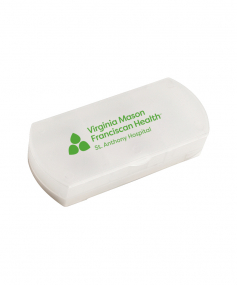 8 Bandages. 3 Separate Compartments. Bottom Slides Open To Access Bandages. Bandages Are Latex Free. Meets FDA Requirements. Complies with Prop 65. 4 1/2" W x 2" H