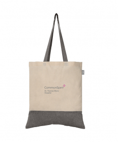 Step into a brighter future with our recycled cotton tote. This nature-inspired masterpiece redefines fashion. The upper part of the bag is made from a blend of 70% recycled cotton and 30% recycled polyester, giving it an elegant style. The lower section and handles, made from 5 oz. recycled cotton in mixed colors, add a chic color-block effect. The bag's spacious interior is a testament to both design and functionality, making it ideal for shopping, commuting and more.